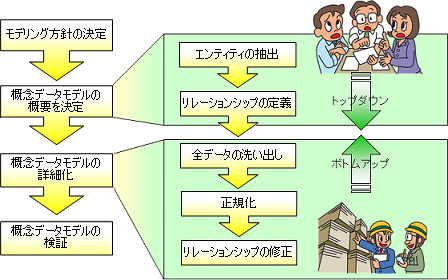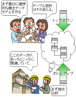 データモデリングには、トップダウンアプローチとボトムアップアプローチがあります。