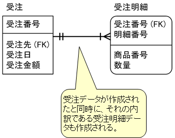 例えば、「受注」エンティティと「受注明細」エンティティがこれに当たります。受注したときに受注データが作成されます。そしてそれと同時に、どのような商品をいくつずつ受注したのかという受注明細データも作成されます。受注がキャンセルされた時には、受注データだけでなく、受注明細データもすべて削除されることになります。また、何らかの障害が発生し、受注明細データは作成できたが、受注データは作成できなかったという場合には、受注データの作成処理だけでなく、受注明細データの作成処理も取り消す(ROLLBACK)必要があります。