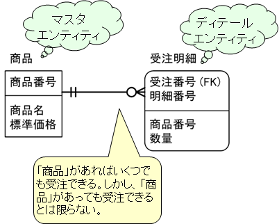 例えば、 「商品」エンティティと「受注明細」エンティティがこれに当たります。1側の「商品」エンティティはマスタエンティティです。多側の「受注明細」エンティティはディテールエンティティで、商品が登録されていないうちから受注が発生することはありません。先に商品マスタにデータが登録されたあと、受注を受け付けることができます。
