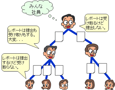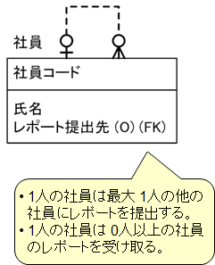 例えば、1人の社員は1人の他の社員にレポートするとします。つまり、プロジェクトのメンバーはプロジェクトのサブリーダに、サブリーダはプロジェクトリーダにレポートを提出するわけです。そして、1人の社員は0人以上の社員のレポートを受け取ります。つまり、プロジェクトサブリーダやプロジェクトリーダはレポートを受け取りますが、プロジェクトの一般のメンバーはレポートを受け取らないわけです。