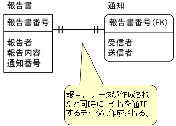例えば、「報告書」エンティティとその発生を知らせる「通知」エンティティがこれに当たります。報告書データを作成すると同時に、そのデータ作成の完了を知らせる「通知」データも作成されます。