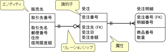(FK) は、他のエンティティの主キーと関連付く識別子や属性を示す(外部キーと呼ぶ)