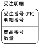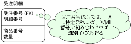 また、複数の属性を組み合わせて識別子となる場合もあります。たとえば、「受注明細」エンティティには、「受注番号」、「明細番号」、「商品番号」 、「数量」の4つの属性があるとします。このとき、 「受注番号」、「明細番号」を組み合わせれば「受注明細」のレコードを識別できるので、この2つの属性を組み合わせて1つの識別子とすることができます。