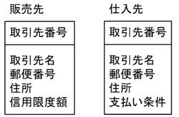 次に、「仕入先」エンティティの属性を検討してみましょう。販売のための属性である「信用限度額」は必要ありませんが、「支払い条件」などの仕入れのための属性が必要となってきます。しかし、「取引先番号」「取引先名」「郵便番号」「住所」などの属性は、「販売先」エンティティと同様に必要です。