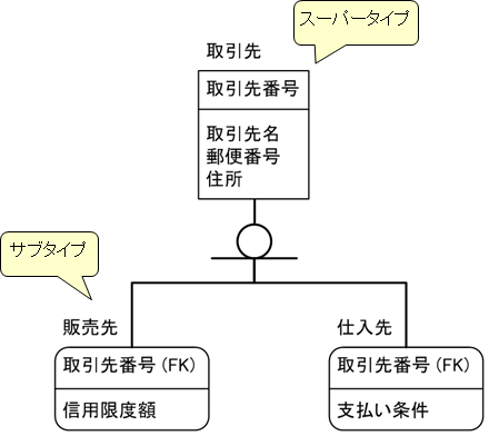 そこで、 「取引先番号」「取引先名」「郵便番号」「住所」などの共通な属性だけを持つスーパータイプと、それぞれ固有の属性のみを持つサブタイプに分けて表現します。