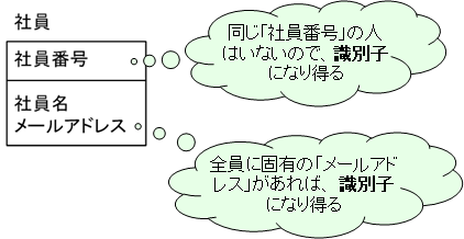 つまり、「社員」エンティティには、「社員番号」と「メールアドレス」の2つの識別子が存在することになります。識別子は、主キーの候補となります。エンティティ内のいくつかの識別子の中から、1つの主キーが決まります。