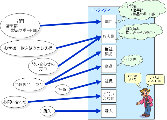 もちろん、エンドユーザも設計者に任せきりにしないで自分たちの要望をしっかり説明すべきですが、それ以上に設計者がエンドユーザの要望を引き出すべきです。 「当社製品」という表現を書きとめ、 「当社製品といわれましたが、それ以外の製品もあるのですか?」と聞けばよいのです。「いいえ、ありません。」といわれれば、「製品」エンティティだけを考えればよいのだし、「はい、他社から仕入れた商品も販売しています」といわれれば、 「商品」エンティティを加えればよいのです。