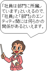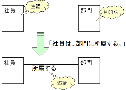 例えば、「社員」エンティティを主語、「部門」エンティティを目的語にして考えてみます。主語ということは、「社員は」や「社員が」となり、目的語ということは「部門に」や「部門を」となります。この2つの言葉で文章を作ると「社員は部門に所属する」という文章になります。