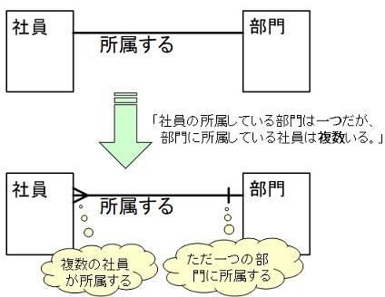 次に、カーディナリティ(種類の数)を考えてみます。つまり、「社員はただ一つの部門に所属する」のか、「社員は多数の部門に所属する」のかです。そして、その結果を目的語の近くに表現します。「ただ一つ」なら縦線(