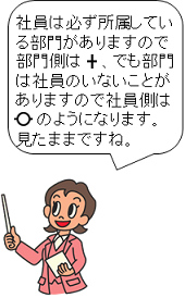 )になります。逆に、「部門」からみた「社員」は任意であり、「社員」側は丸(