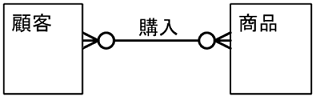 例えば、「顧客は複数の商品を注文する場合がある。また、商品も複数の顧客に注文される場合がある。」という関係をER図にしてみると図のように多対多の関係になります。