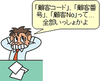 また、「コード」、「ID」、「番号」、「No」などは、意味を持って使い分けているのか、その時の気分で命名しているのかが判断することができません。「顧客コード」、「顧客番号」、「顧客No」などが、同じものを示しているようでは、誤解のもととなります。統一した命名規則が必要となります。