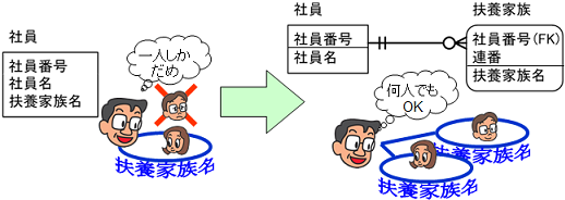 ようするに、「社員」エンティティで「扶養家族名」属性を管理するべきではなかったのです。「社員」エンティティと1対多のリレーションシップを持つ「扶養家族」エンティティを定義すべきだったのです。