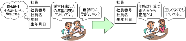 次に、例えば、「年齢」属性が「社員」エンティティにあったとします。しかし、年齢は今日の日付から生年月日を引き算すれば求めることができます。このように他の属性から導き出すことができる値は導出属性といいます。属性としてエンティティに残す必要はありません。