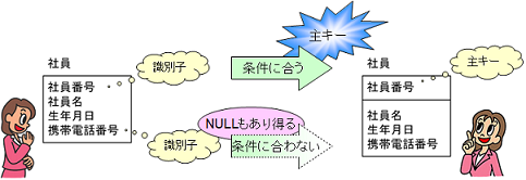 「社員番号」が主キーの候補として一番に考えられますが、「携帯電話番号」も主キーになり得るかを考えます。 しかし、「携帯電話番号」も識別子ではあるのですが、主キーにはなりません。なぜなら、「携帯電話番号」にはNULLが存在する可能性があるからです。NULLとは、「値がない(未定)」、「値が不明」という状態を表しています。つまり、携帯電話を持っていない社員には、「携帯電話番号」が未定のままです。しかし、社員ではあるので携帯電話を持っていない社員たちのデータも必要です。ですが、「携帯電話番号」に値がないために、この複数の人たちのデータを限定することができません。