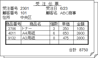 例えば、次のような伝票が使用されていて、この伝票をデータモデリングするとします。まずは、この伝票から属性とすべきものを洗い出します。
