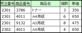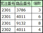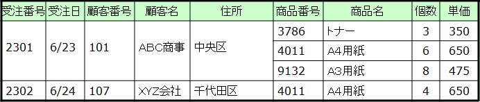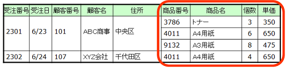 サンプルデータでは、「商品番号」、「商品名」、「個数」、「単価」といった属性の値が、「受注番号」2301に対して、 繰り返し存在しています。これらの属性が繰り返し項目です。