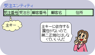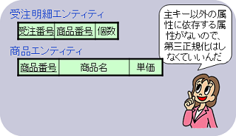 ちなみに、 「受注明細」 エンティティや「商品」エンティティは、主キー以外の属性に依存する属性がないので、第三正規化の必要はありません。