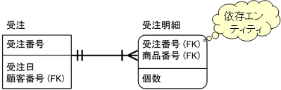 ここで、「受注」エンティティ1つに対して、 「受注明細」エンティティは1つ以上あるわけですから、1対多のリレーションになります。