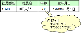 「年齢」のように、同じレコード中の「生年月日」から求められる導出項目です。こうした項目は、存在しなくてもそれほどの負荷もなく求められるので、特に存在させる必要はありません。