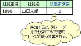 「扶養家族数」のように、別テーブル中のレコード件数などから求められる導出項目です。こうした項目は、存在しないと必要となるたびに別のテーブルを検索することになるので、物理的I/Oが増えます。データベース検索のパフォーマンスは「どれだけ物理的I/Oを少なくするか」にかかっています。テーブルの結合をできるだけす少なくすることで、データベースのパフォーマンスは改善されます。