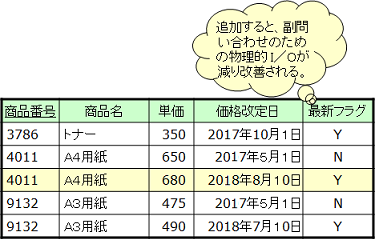 (最新の「価格改定日」 を求めるには、全レコード検索しなければならないが、 「商品番号」と「最新フラグ」で検索すれば、見つかったところで検索をやめるようにもできる)