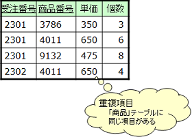 「商品」テーブルで管理している「単価」を「受注明細」テーブルでも管理する場合、「単価」は2つのテーブルで管理されることになるので、重複項目となります。