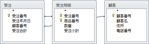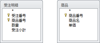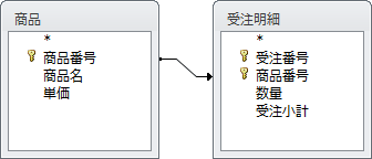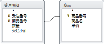 [受注明細]と[商品]の間の線は、同じ名前の列同士の間で自動的に引かれますが、引かれない場合は、[受注明細]の[商品番号]を[受注明細]までドラッグすると引かれます。([受注]の[商品番号]上でマウスの左ボタンを押し、そのまま離さずに、[受注明細]上までマウスを移動させ、ボタンを離すと引かれます。)