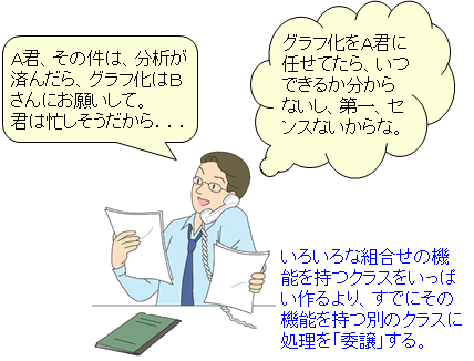 「委譲」 とは、実行時に引き渡されたインスタンスを保持し、そのメソッドを呼び出すことです。つまり、 「仕事をしろ」といわれたら、そのインスタンスのメソッドに丸投げするわけです。