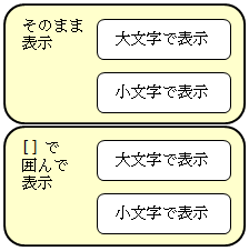 大文字で表示する DisplayUppercase、小文字で表示する DisplayLowercase があるにもかかわらず、[] で囲む DisplayOrnamentUppercase や DisplayOrnamentLowercase の中にも大文字や小文字にする機能を作らなければなりません。 よって、(大文字小文字の2種類)×(修飾有り無しの2種類)分のクラスが必要になります。 |