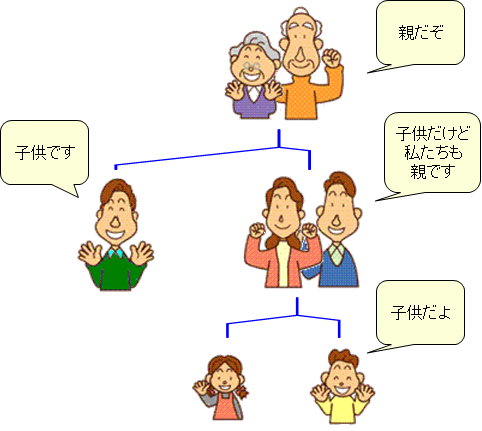 また、家族関係などもこうした例です。親子三代の家族です。一代目の夫婦は、二代目の親です。しかし、二代目の夫婦は、一代目のおじいさん、おばあさんから見れば子供ですが、三代目の孫の親でもあります。