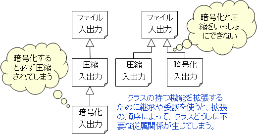 かといって、圧縮機能を持ったクラスを更に継承して作ると、今度は圧縮しないで暗号化することができなくなってしまいます。