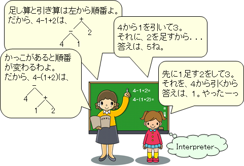 この例では、演算式を解析し、逆ポーランド記法で書きなおされています。これを計算して答えを得ます。 逆ポーランド記法 1 + 4 * 2 → 1 4 2 * + (1 + 4) * 2 → 1 4 + 2 * 取り出したものが演算子だったら、スタックから次の2つを取り出して演算します。しかし、取り出した中にまた演算子があったら、それは式なので、またスタックから次の2つを取り出して...というように繰り返します。ここでは、再起呼び出しを利用しています。計算はうまくできているようです。 しかし、この後減算と除算を追加しようとしたら、calculate() に新たに減算と除算のための if 文を追加しなければなりません。これでは拡張性が良いとは言えません。 |