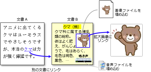 ハイパーテキスト(HyperText)とは、ハイパーリンクを埋め込むことができる高機能なテキストです。ハイパーリンクというのは、ウェブページで下線の付いたテキストなどをクリックすると別ページへ移動するリンクのことです。ハイパーテキストでは、ウェブページから別のウェブページにリンクをはったり、 ウェブページ内に画像・動画・音声などのデータファイルをリンクで埋め込むことができます。 HTMLには、このハイパーリンク機能で関連する情報同士を結びつけて、情報を整理するという特徴があります。